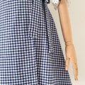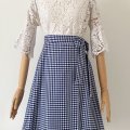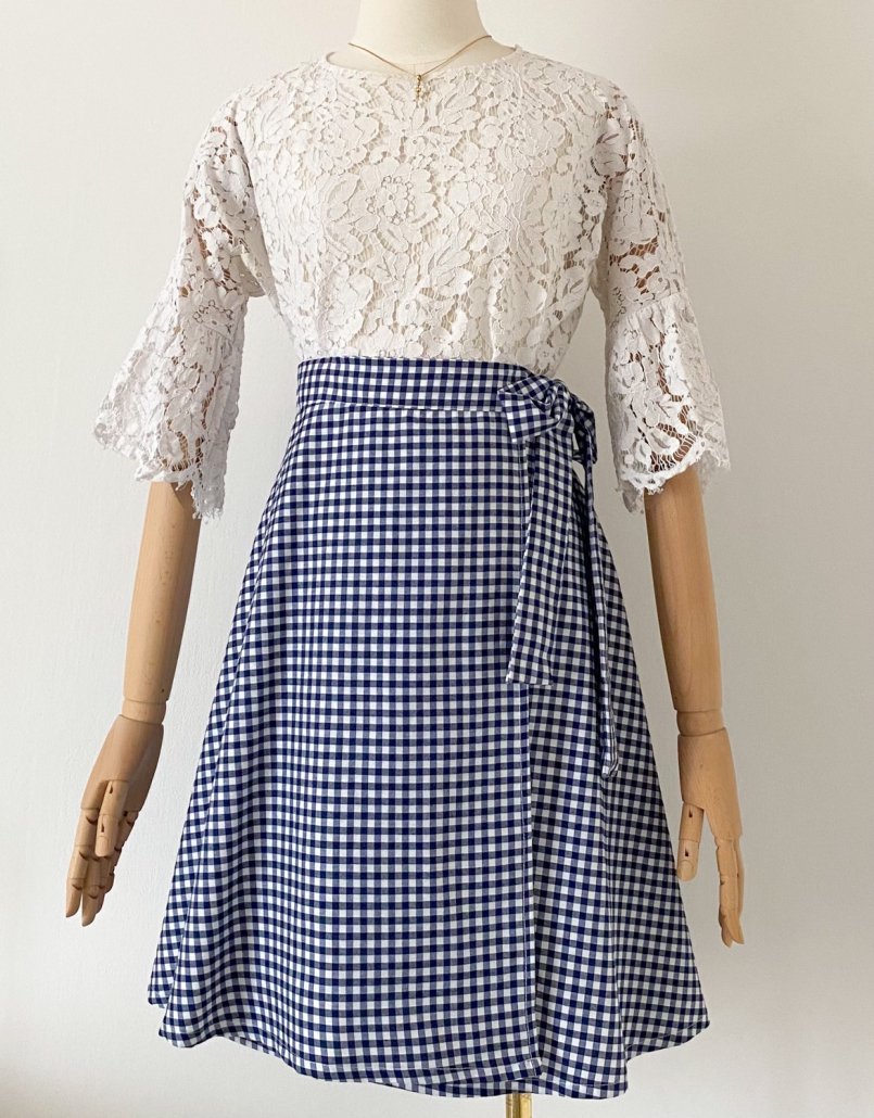 Gonna a portafoglio in cotone fantasia vichy bianco e blu navy.