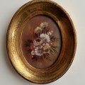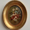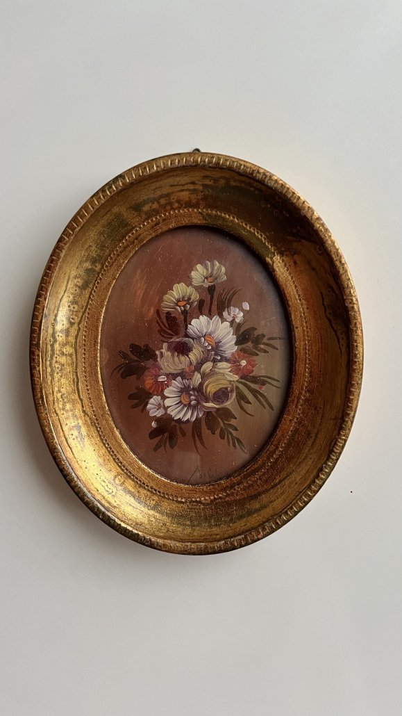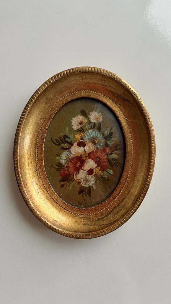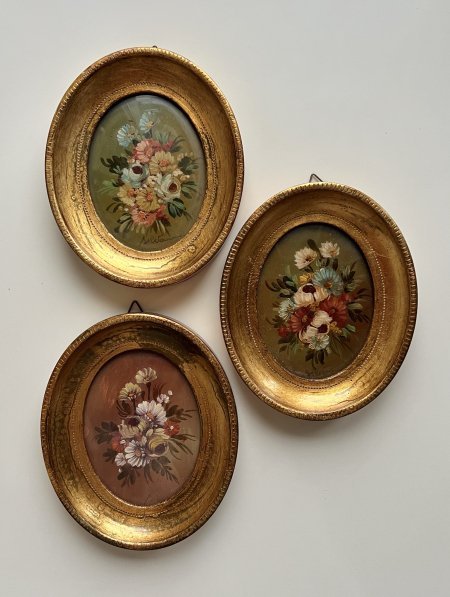Set di tre quadretti vintage abbinati tra loro e dipinti a mano con raffigurazione di fiori.