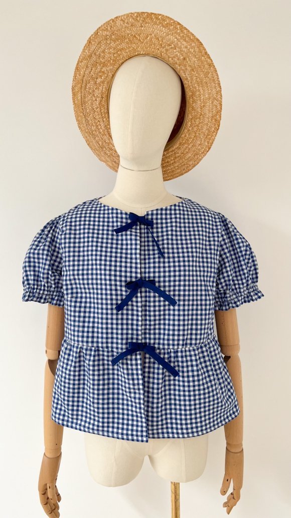 Camicia in cotone a fantasia vichy bianco e blu elettrico, con fiocchi blu da annodare.